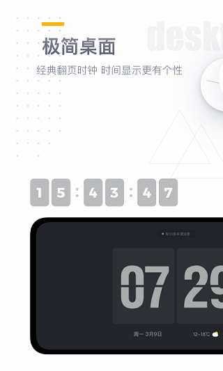 翻页时钟是一款非常专业的手机时间管理软件,它能够为用户提供各种实用功能和个性化设置。该软件界面简洁明了,操作也十分方便易用。它不仅提供了实时的时间信息查询服务、日期计算器以及计时器等等多种特色工具来帮助您更好地规划行程安排,还可以根据自己的喜好定制最适合您的闹铃提醒方式,使您的生活更加便捷高效。除此之外,这款翻页时钟app使用起来很简单,只需要选择自己需要使用的时钟样式即可进行自定义设定,并且还支持添加多个倒计时日记本等内容的记录与备忘录的功能哦,喜欢的朋友不妨下载试试吧!