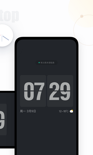 2、拥有全屏翻页时钟、模拟秒表、天气预报等多种炫酷时钟特效。
