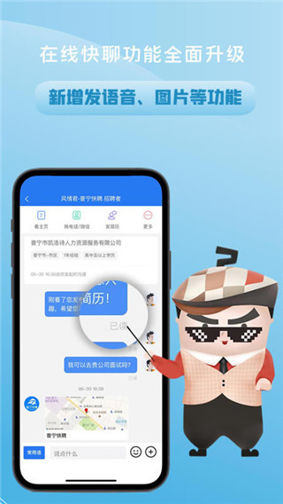 强大的聊天工具可以发送文字、图片或者语音和其他形式的消息供你自由分享你的求职心得和感受,增加了求职过程中的趣味性。