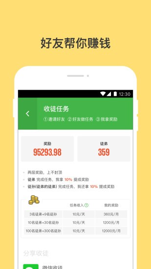 【收益提成】:分享好友成功注册APP就可获得1元的高比例返利,支持微信、支付宝多种方式快速收徒弟及其他分红。