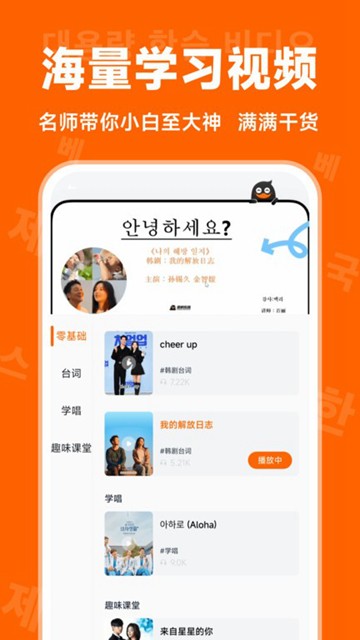 冲鸭韩语学习的软件是专为想要学好韩剧、韩影的小伙伴准备的app软件,帮助你快速入门,轻松追到自己感兴趣的韩语课程内容;软件提供大量韩国热门歌曲和韩语电影供大家选择使用。同时还提供了各种有趣的韩语游戏以及短视频教学哦,非常实用,喜欢就来绿色资源网下载体验吧!