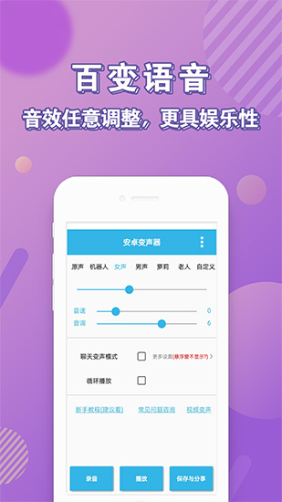 安卓变声器是一款超级好用的可以对声音进行改变的应用软件,软件内置超多的语音包资源让您根据自己的需求随意挑选使用哦,还能够自定义设置背景音等信息一键分享发送到微信好友和微博朋友圈。有需要的用户快来下载试试吧!