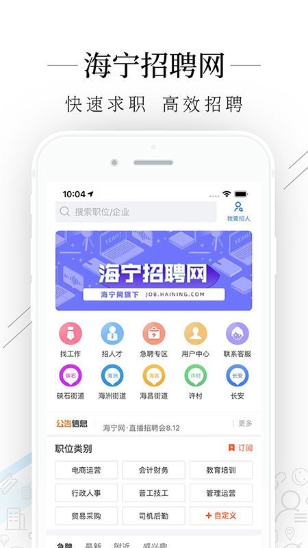 海宁招聘网app是一款专注于求职招聘的手机平台,在海宁招聘网上面用户可以看到非常多的职位信息和岗位资源等相关的内容服务功能哦,而且海宁招聘信息在这里也都是经过严格筛选审核过的优质好工作等等,快来下载吧!