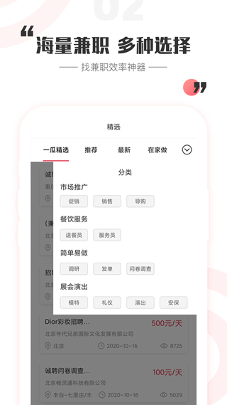 一瓜兼职能让用户寻找到诸多职位信息吗?一瓜兼职能让使用者寻到诸多招聘信息,可以帮助求职者找到满意的工作和岗位。该软件提供详细的招聘流程、薪资待遇以及工作地点等介绍;通过这款APP您可以轻松浏览各种类型的公司或企业的相关资料并进行筛选与比较!