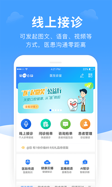 全一e诊医生端是“全国第一家互联网医院”,由中国领先的技术团队开发。以提供医疗卫生服务为使命,整合了全球优质医院资源,致力于让医疗健康更美好!