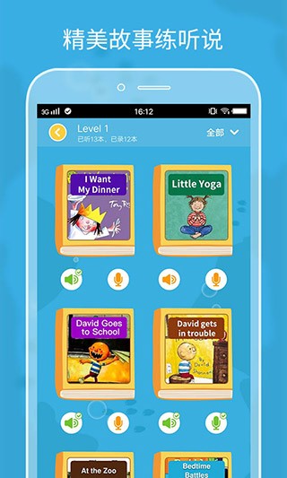 用户可随时随地在线观看英语绘本故事视频并下载至本地设备中观看,实现随时随地的英语学习需求;