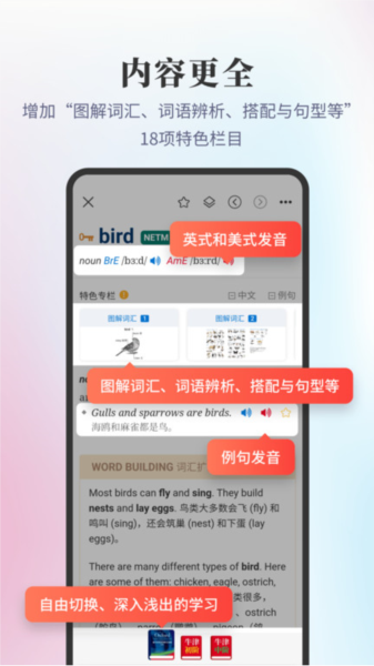 真人发音:提供标准的美式及元韵儿发音,支持跟读模仿跟读背诵操作。
