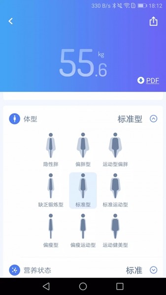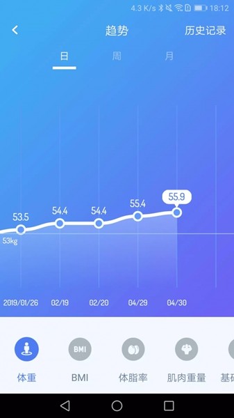 1、智能测量:通过手机蓝牙与体脂称进行设备连接并实时监测体重变化,包括BMI指数、脂肪率、蛋白质、肌肉量和水分等。
