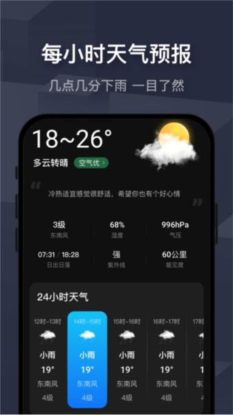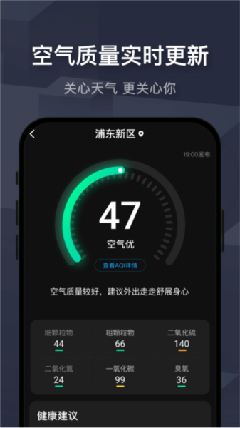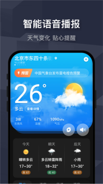,天气监测站尽在掌握;:异常天气及时提醒,提供防御指南助您防范气象灾害;:地方话播报天气状态,懂你的手机天气专家;:动态天气背景效果图,跟随天气变化、日夜交替显示更美观。提供多种多样的桌面的天气插件供你选择更换字体大小等样式。支持自定义主题皮肤颜色搭配您的专属天气APP。简约白天模式、黑暗模式任意切换轻松应对各种天气情况。展示当天气温趋势,给您直观展现当日风力和气压等内容。紫外线强度,运动强度,洗车指数,感冒程度,穿衣指数让生活更加便利。一键分享到微信、qq,关心您身边的亲人。遇见天气亮点: