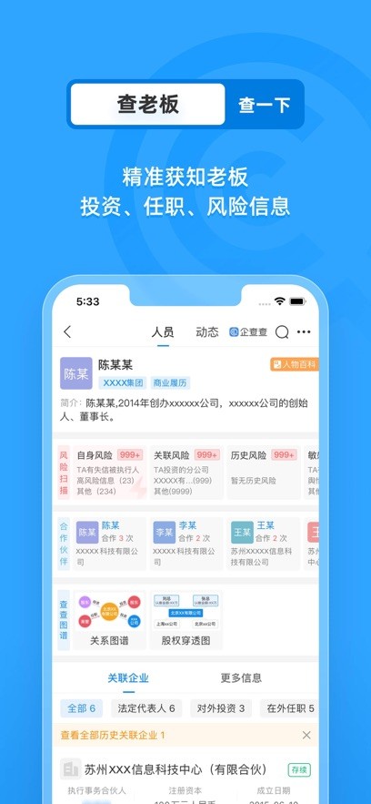 企查查询企业信息查询工具,企业信息查询app。用户下载app后就可以在线搜索自己感兴趣的企业或者行业等各种关系资料详细查看了解;还有企业信用评估报告、商业关系挖掘分析等等功能服务哦,帮助企业管理自己的信用数据吧,赶紧下载体验吧。