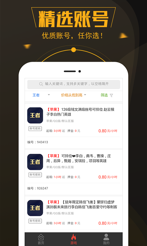 4、在线随时随地都可以在手机上来寻找适合自己的手游账号了哟;