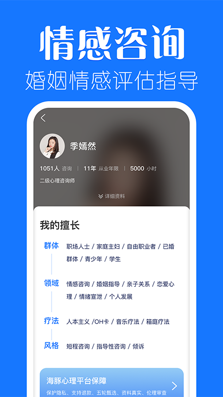 海豚心理是一个专业的心理咨询工具,它具有强大的心理咨询师团队,涵盖情感、恋爱、工作、儿童、青春期、育儿等多个领域,为广大的家长和学生提供了全方位的服务保障。