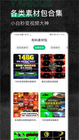 打开有料素材APP后,可以看到有很多分类标签如绿幕素材,用户可根据自己的喜好随意浏览这些类型的素材,
