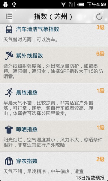 根据天气的变化为您带来生活指数参考资讯提醒:洗车、感叹号等等。