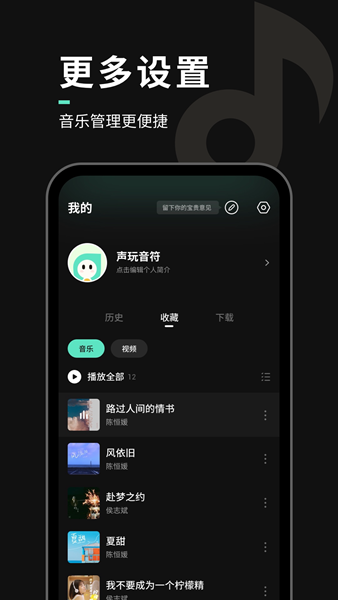 声玩音乐一款超级好用的支持用户在手机端进行歌曲播放的平台软件,软件收录了超多的曲风类型让您随意挑选在线听歌更加有趣,自带榜单为您推荐最新热门歌手可以根据喜欢创建自己的歌单收藏喜欢的风格哦,欢迎各位玩家下载试试看哦!