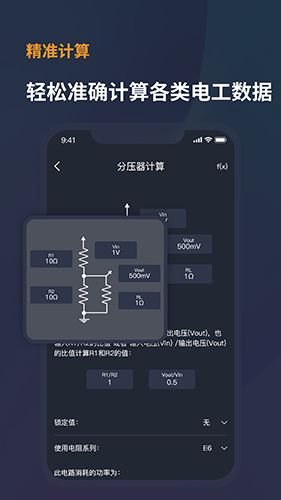 包含了电信号查询、电能转换、功率计数计算、电压电流、负荷表、压力单位换算、电费估值、电量管理等多种实用工具。