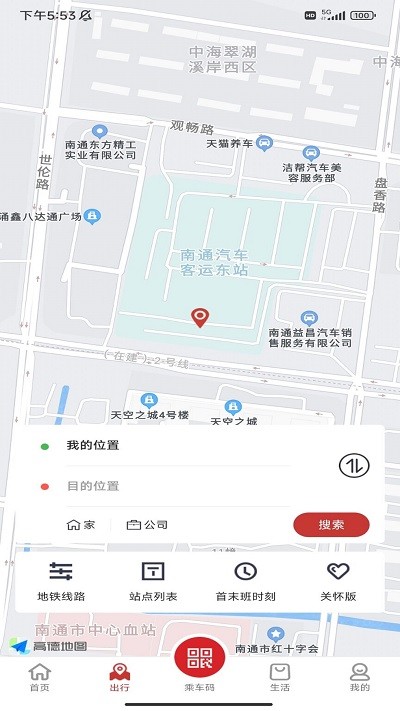 1、进入南通轨道交通APP首页,找到下方导航栏中的乘车站点(如地图上的红色标注),输入乘坐的起点,点击搜索按钮。(注意的是:输入乘坐的目的地,请先选择要出发地的地铁站)