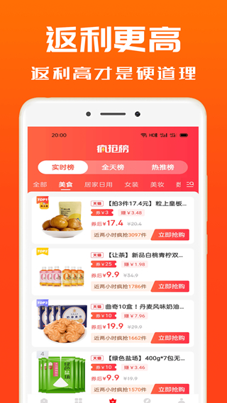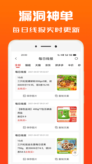 5、限时抢购:爆品实时推送,每日十点更新上万款白菜价商品供您选择;