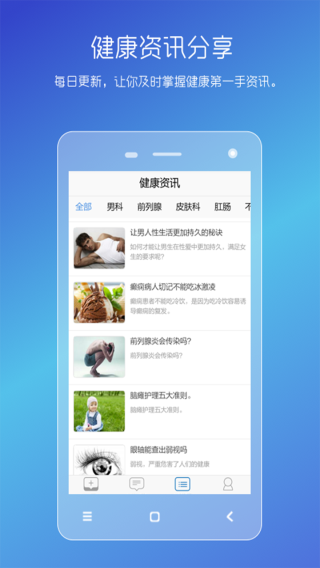 男性私人医生是款专业的健康咨询平台,这里有非常多的医疗知识。你可以随时随地向医生询问各种疾病的详情信息并进行解答。同时你还可以和他人一起交流自己的问题哦。欢迎有需要的朋友下载使用!