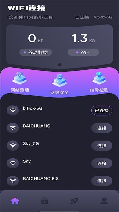 直观展示当前wifi网络情况,掌握当前连接状态与上传速度;