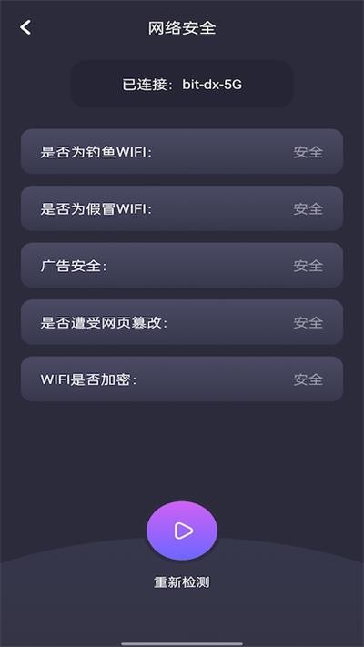 3、WiFi安全监测:实时监测当前无线热点安全,主动防御风险WiFi,防止钓鱼网、DNS篡改等不良网络;