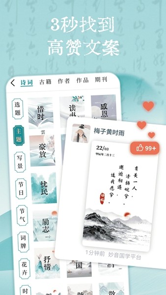 妙音国学是北京趣音文化股份有限公司制作的一款国画学习软件,这款软件可以让用户轻松地在线学习各种国文内容哦,还有名师在线直播教学等你来体验哦,同时还有丰富的古诗词供你欣赏哟,需要的朋友就快来下载使用吧!