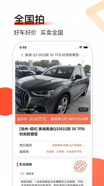 通过全国拍App轻松实现“一秒出价”,让你足不出户就能享受到全国各大城市的车况检测报告。