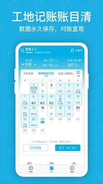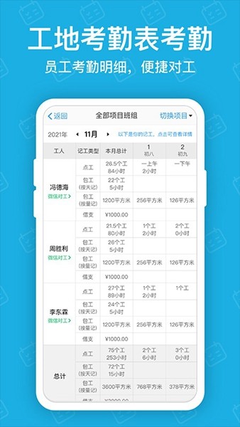 吉工考勤是专为建筑工人所打造的一款工作软件,它能让你在手机上进行工资核对、请假等功能的使用使用。通过这款软件你可以快速完成上班打卡记录与记账操作以及相关费用结算等等服务内容!