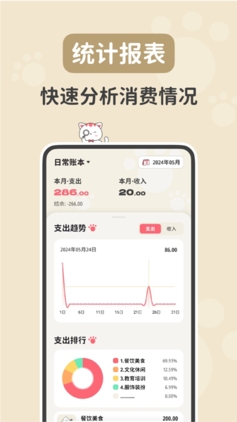 可自定义每月花销总览表格展示当前收支比例,以饼状图的形式展现每日收银情况。