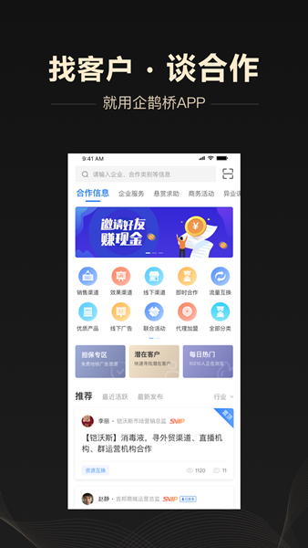 企鹊桥是一款专为企业用户打造的线上商务社交app,软件中有着海量的实用功能等你体验,还可以搜索关键词进行快捷查询操作使用,一键快速开启在线沟通模式感受不一样的交友乐趣,对软件感兴趣的话不妨点击下载试试!