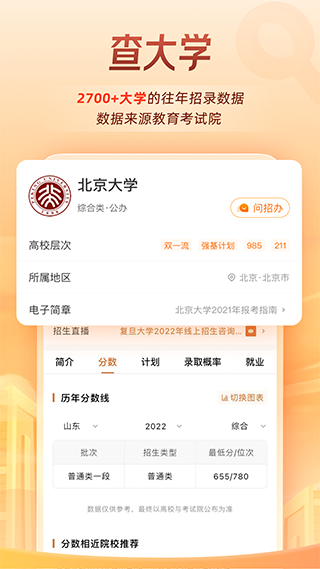 1、全国2800多所大学全面覆盖; 2、高考分数线数据准确及时; 3、独家原创权威资讯实时更新; 4、全新高考成绩分析系统上线,助您快速获取高分数参考价值!