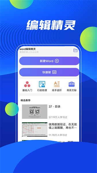 word编辑精灵是手机word编辑精灵,word在线学习平台。word在线学习课程包含word入门知识、office技能教程、excel函数、word函数、Excel函数等。word在线视频教学,从word入门到高手进阶式提升,word在线学习课堂,随时随地轻松学word。word在线学习涵盖了丰富的Word在线学习资源,包括Word文档模板、wordPPT技巧文章、wordPPT素材等。word在线学习支持在线阅读Word文档与word文档转换成PDF格式文件;word在线学习有word文档文字排版、wordPPT字体设置、wordword段落样式调整及公式单元格制作等功能模块,让您在手机上也能高效完成word文档处理,实现移动办公新风尚。