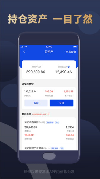 “诺金”app是一款集基金交易、资产管理、账户查询于一体的手机应用软件。用户通过该app就可以进行基金购买与赎回操作等功能使用,随时随地想买就卖,非常方便快捷。