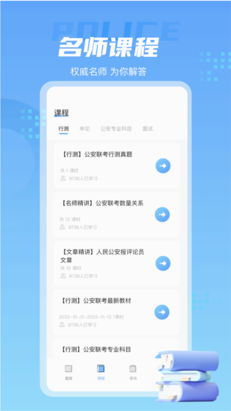 警考通app是专门为警务协警协警协警协警协警联警察考试所设计的,软件功能强大且全面,拥有海量历年真题、名师视频等资源供用户进行学习。同时该软件还支持离线下载课程以及在线刷题训练等等服务!