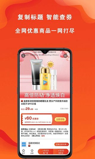 输入商品标题或者扫描淘宝/京东/天猫/拼多多/唯品会/考拉等关键词来精准检索相关商品及对应隐藏优惠券与粉丝福利。