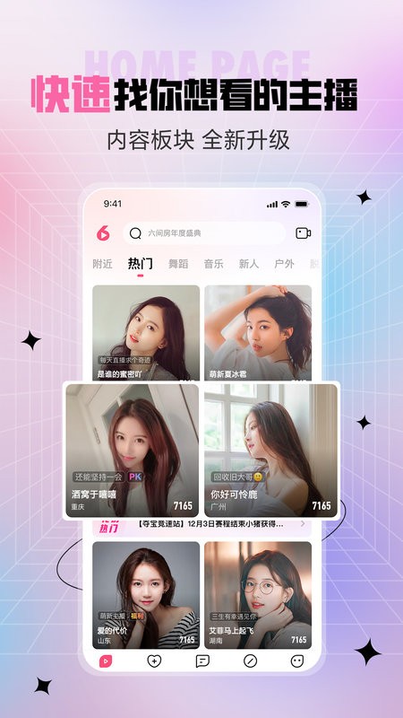 六间房秀场直播大厅手机版采用了全新的互动方式,用户可以轻松浏览他人发布的动态信息,找到更多心仪的主播;同时也可以通过文字评论、点赞、私信发送弹幕等方式与主播沟通。