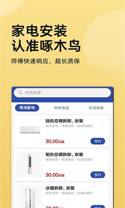 家电安装啄木鸟app可以为用户提供各种家电维修服务,这里有专业的工程师在线上门进行保养。平台上师傅非常专业,你可以选择需要的配件购买到手,软件还提供了一键下单功能和快速响应的服务哦!