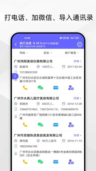 用户可以使用这款软件快速获取到附近的客源信息,支持一键拨号功能,帮助电销人员更轻松地获客,同时提供多种导入通讯录的方式来进行管理客户联系方式等等,需要的可以来西西下载电销客源app操作介绍: