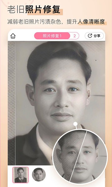 老照片黑白版照片智能修复,一键增强照片色彩。