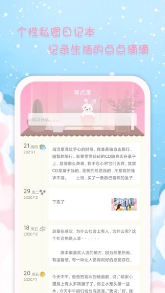 5、社区交流:用户可以在这里发表心得体会、参与话题讨论、分享经验,甚至结交新朋友。女生日记app是款超有趣的健康使用记录表单工具,可以让大家更好地了解身体状况,在使用过程中能够实时提醒用户按时做任务,让你更加方便地进行健康管理,软件界面干净简约,欢迎喜欢的朋友下载!