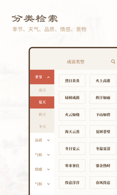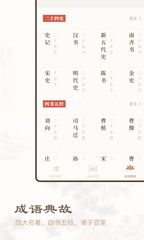 将成语进行多维度的分类显示,如成语来源、出处、典故、典籍、来源等,助力用户更加全面地了解成语;