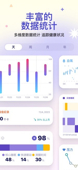 记录运动数据:详细的数据统计展示,并生成详细的运动分析报告,如时长、心率、血氧饱和度等。