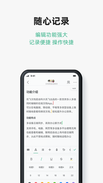 科大的讯飞文档app是一个为企业打造的智能协同、高效团队学习和移动办公应用程序。它能够满足企业内部沟通交流的需求,包括文字编辑器、多人实时语音识别以及丰富的知识库管理功能,让员工随时随地轻松完成各种任务并与他人共享信息。