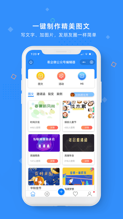易企微公众号采用严格的安全技术保障机制,保护用户隐私和信息安全。易企微公众号图文编辑排版制作个人头像配图,海量图片素材应有尽有;微信、qq、陌陌等主流社交平台上分享的热门图文内容。用户在使用手机上可以直接点击下载自己喜欢的图文模板和字体,还可以将自己设计好的图片添加到自己的朋友圈当中哦!