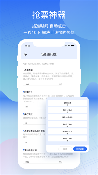 1、可自由设定点击位置、点击速度、滑动模式、触摸时长等参数配置,以满足个人偏好和习惯;