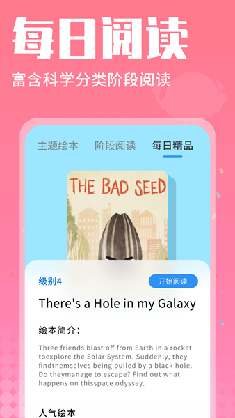 3)科学分级:针对不同年龄段的孩子制定合适的学习方案,包括音频、动画、游戏等不同的形式丰富了学习内容;