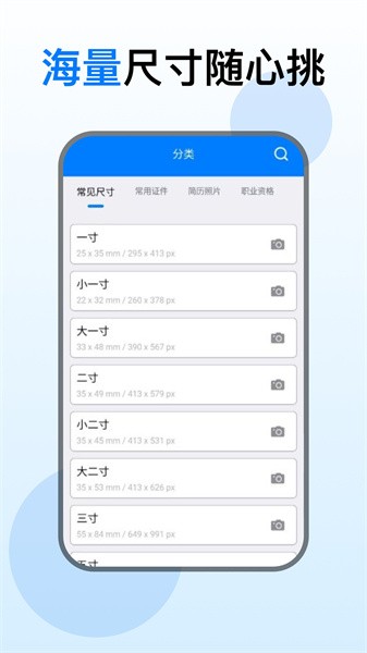 -海量尺寸库,常用证照尺寸全搜罗,一键get,让证件照成为你的贴身证件照!