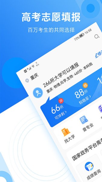测评系统:结合学生的个人情况、报考意愿、性格测试和专业目标,为每个学生量身定制志愿冲刺、稳妥,保底的志愿冲热性,控制升学成本。高考志愿填报app是一款为高考考生们量身定制的高考志愿填报平台,在这里你能找到自己想要报考的大学以及相关专业信息和录取结果等等,帮助高考考生在高考期间取得更好的成绩。需要的朋友快来下载吧!
