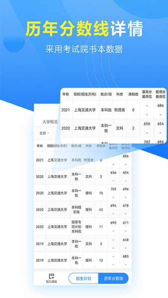 涵盖了历年的招生计划表,以及各省的招生分数线供考生参考使用。