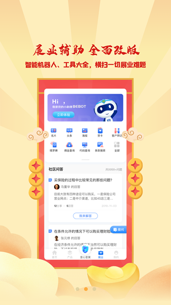 为客户提供便捷、高效的一站式保险业务办理及管理功能;帮助客户实现“一键报案、全员协助”的服务体验;同时支持保险行业内各类业务场景下使用,如:家庭保险、财产保险、健康保险、旅游险、责任医疗保险、企业意外伤害险、旅行寿保障等类型的保单与支付和增值服务(包括:保险代理人入户登记、保费结算、保费发放、保单退回等)、保单核销查询、保单续期申请等各项专业化服务的APP应用。